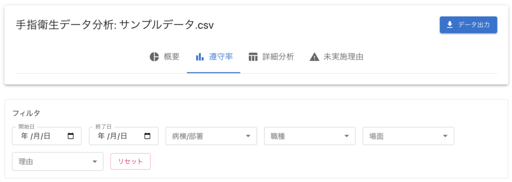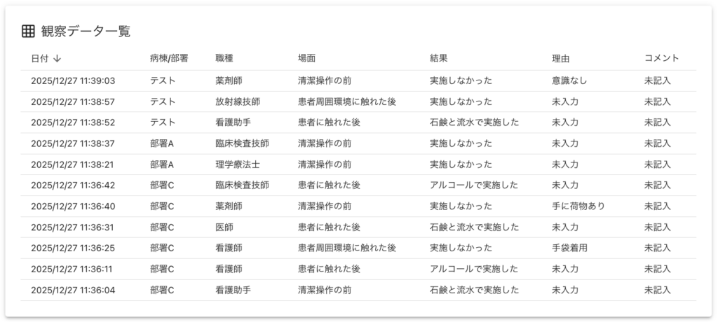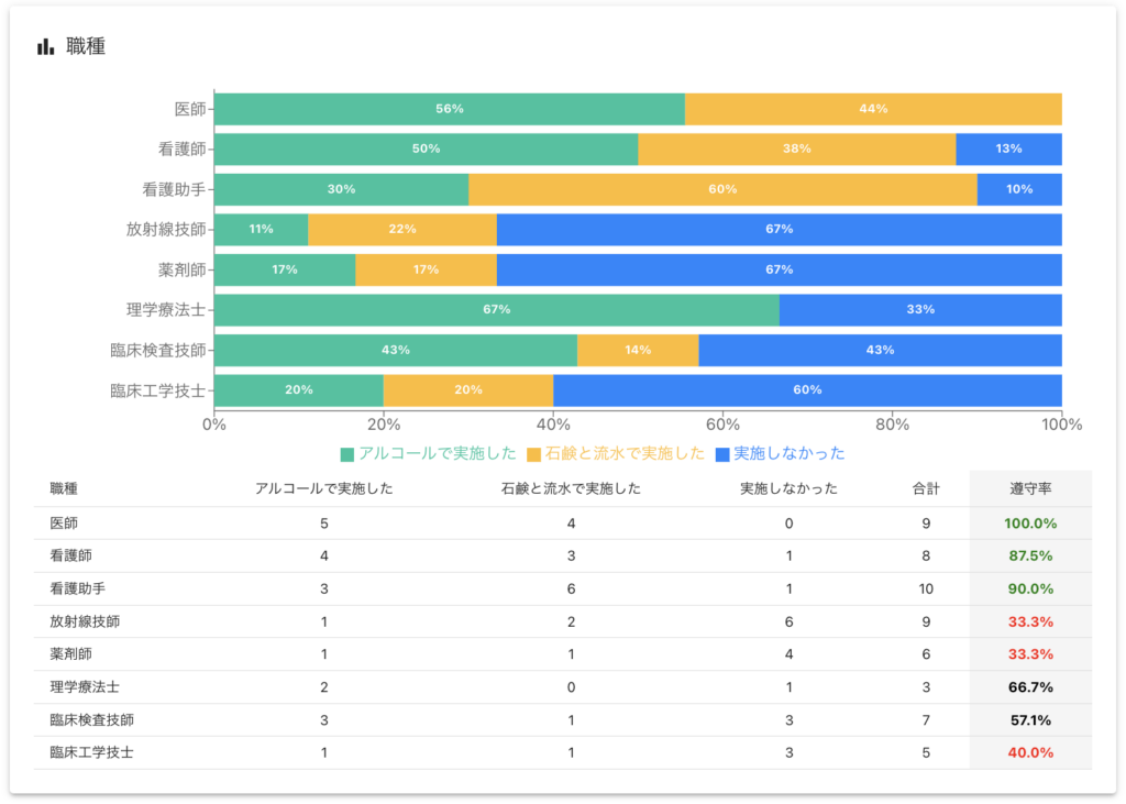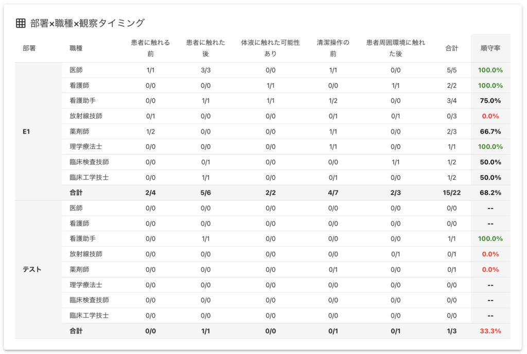- 部署別・職種別・観察タイミング別の手指衛生実施率を自動計算