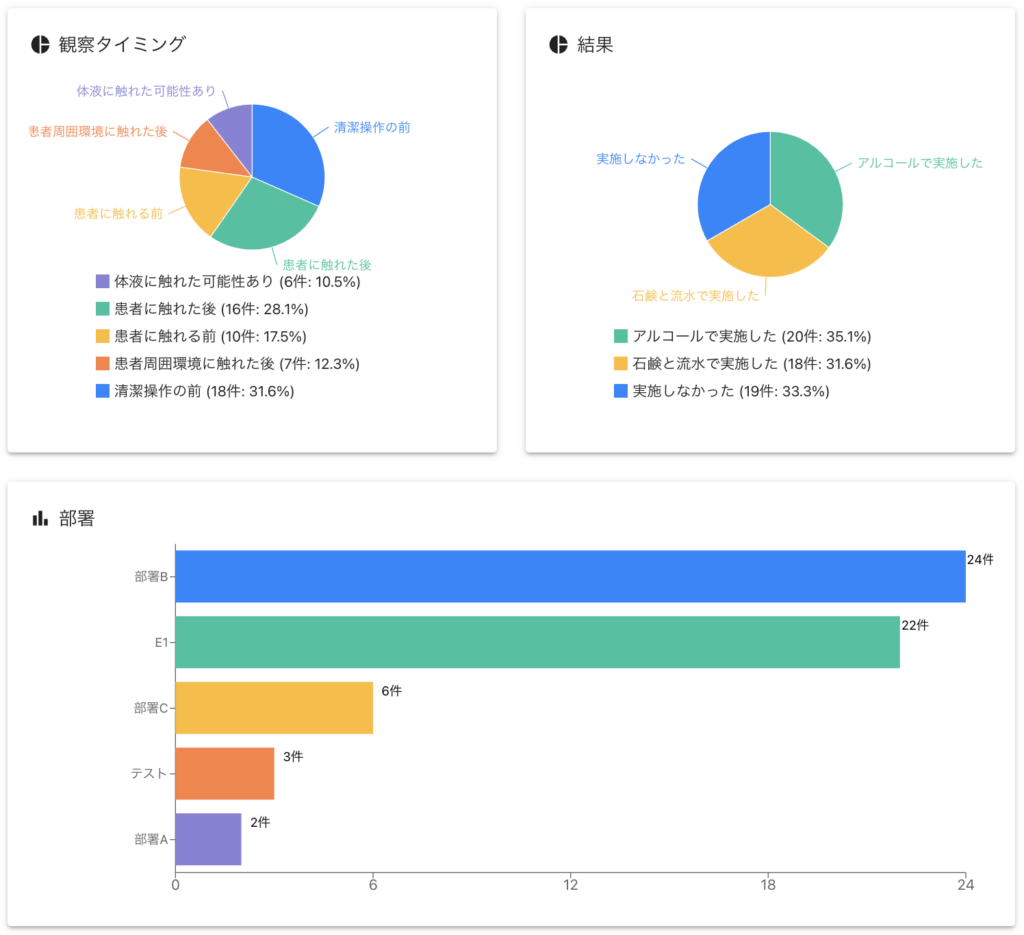 - 円グラフ・棒グラフ・表で、手指衛生の内訳から傾向をひと目で把握可能