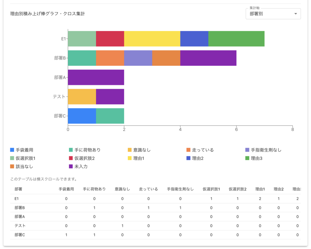 複合条件(部署×職種×観察タイミング)の分析も可能。現場ごとの課題を具体的に特定できます 。