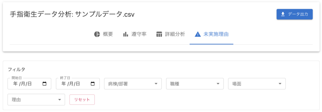 未実施理由画面では、手指衛生を「実施しなかった」場合に入力された理由を集計し、未実施の背景を把握できます。