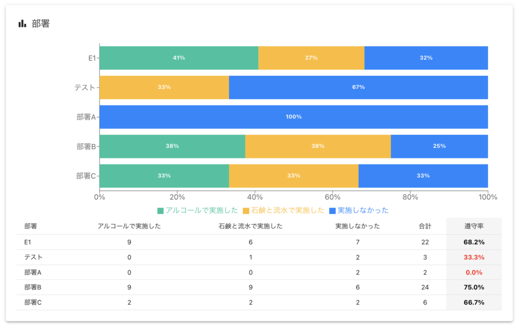 - 棒グラフや表で実施率・件数を数値化し、改善ポイントを把握できます