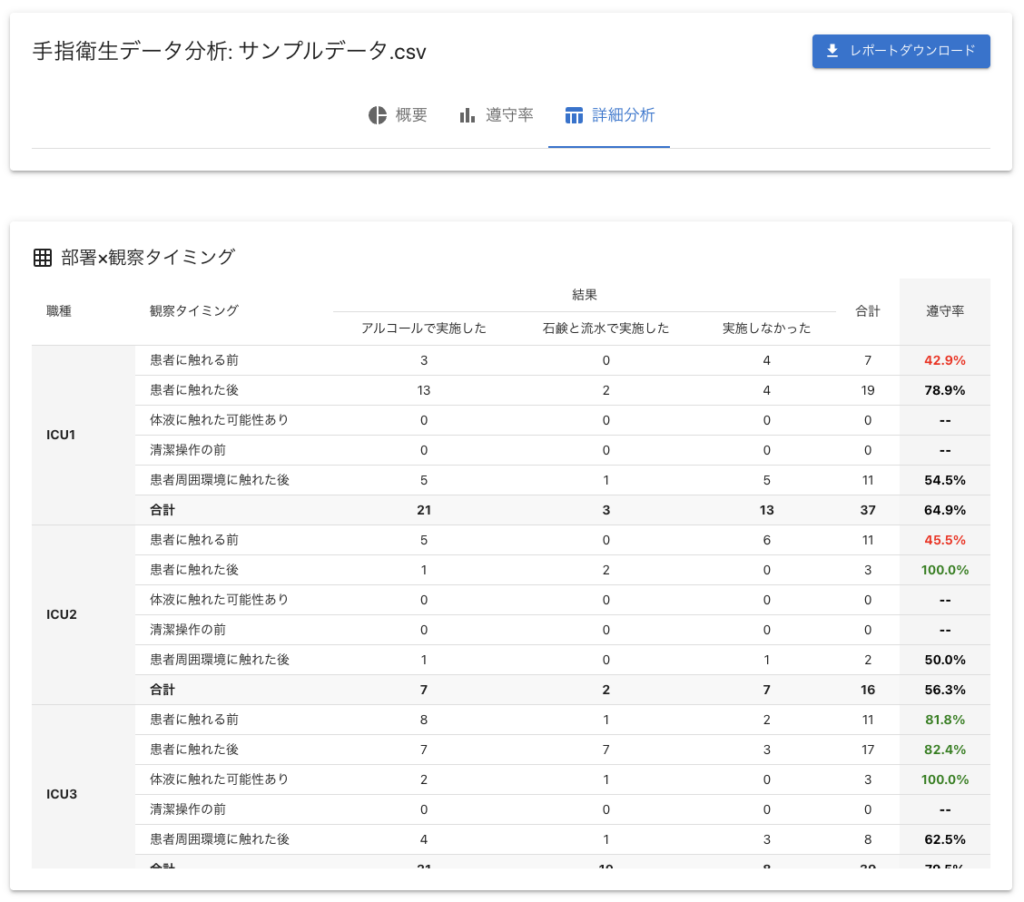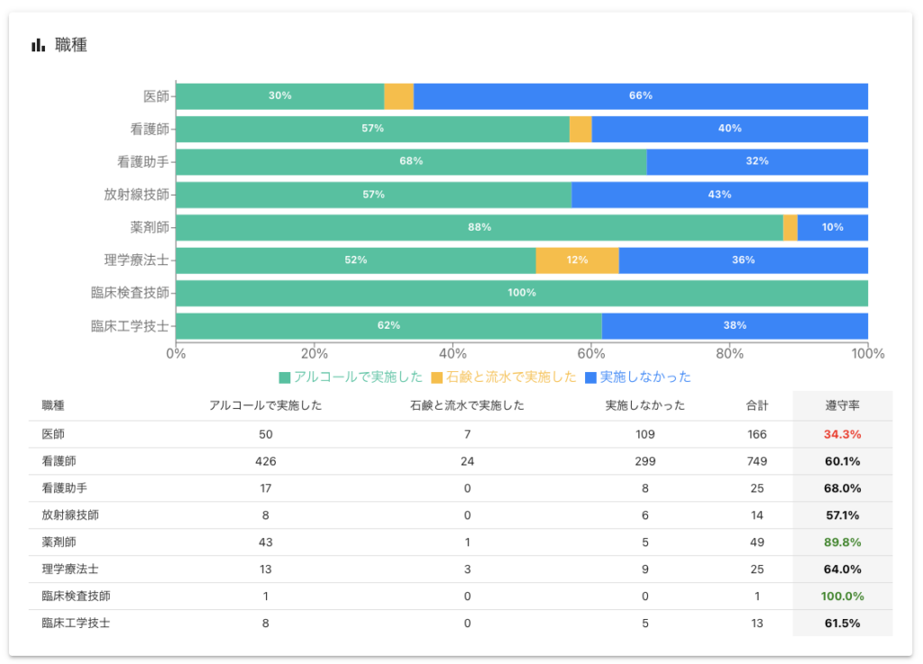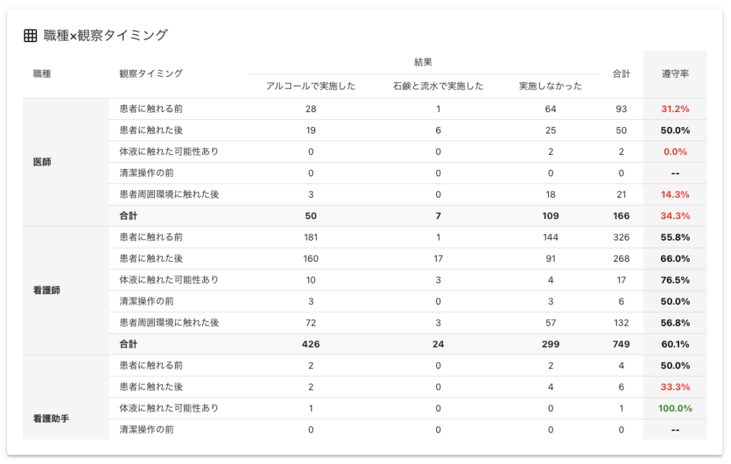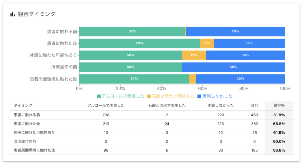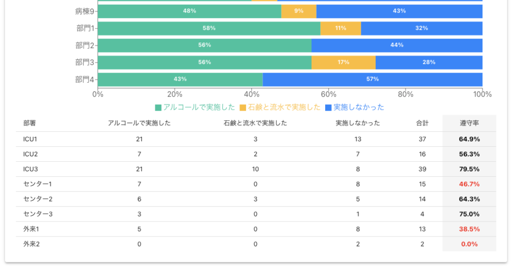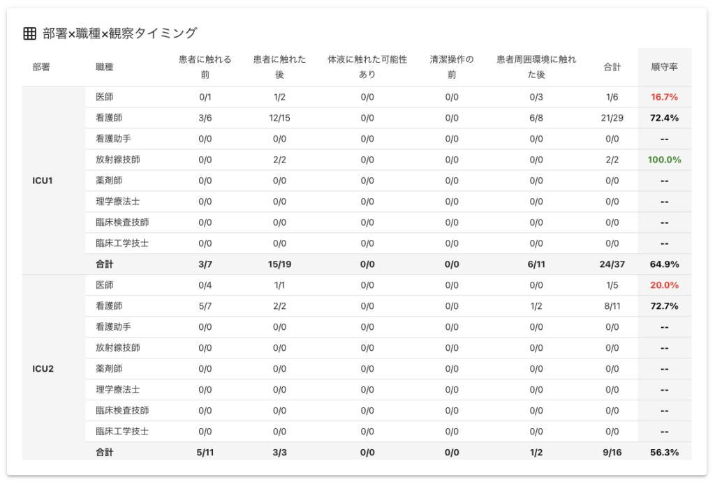 - 部署別・職種別・観察タイミング別の手指衛生実施率を自動計算