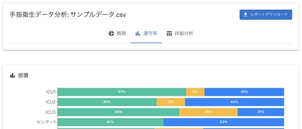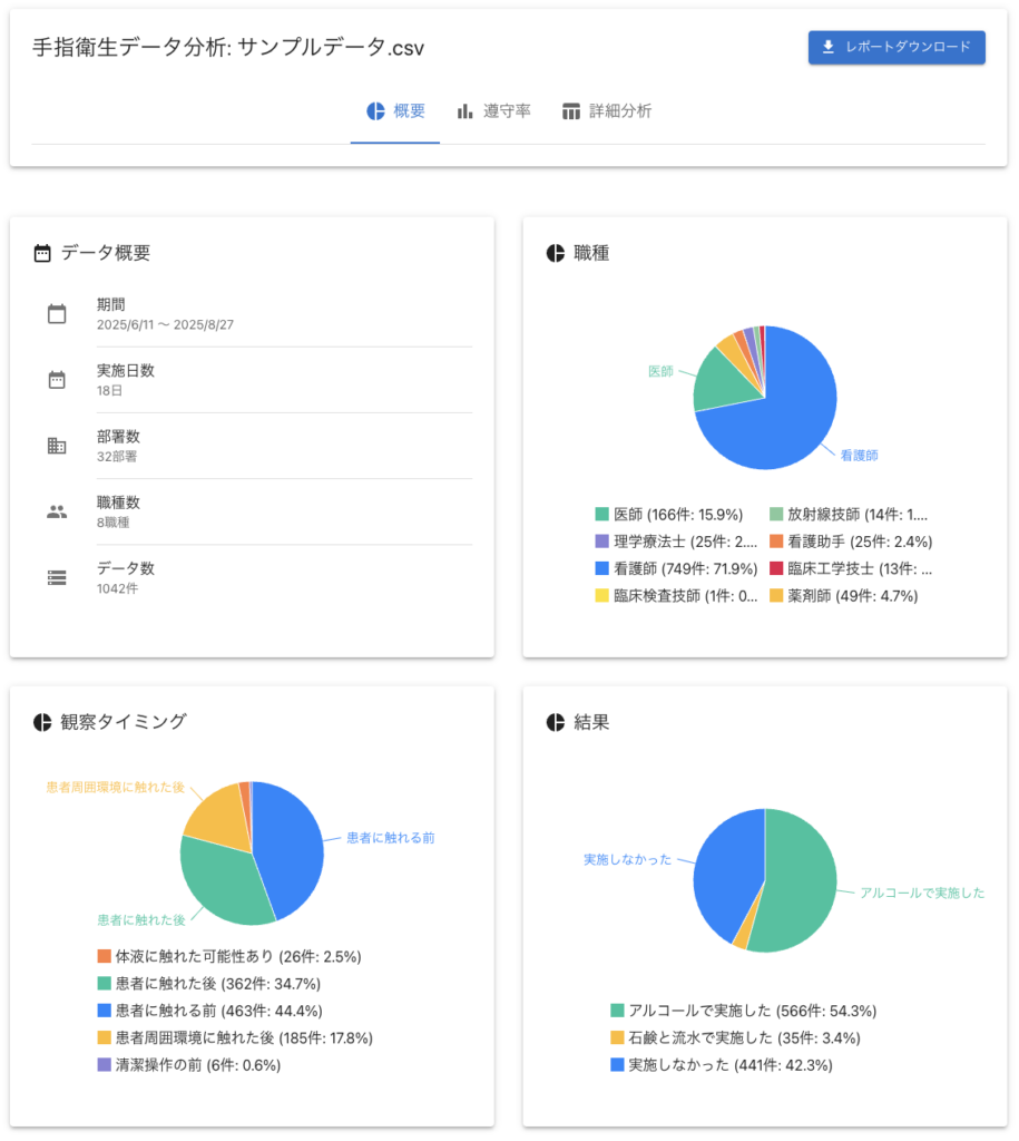 手指衛生データ分析アプリ は、手指衛生ラウンドアプリ(※詳細はこちら) で記録した観察データ(CSV形式)をアップロードするだけで、職種別・部署別の手指衛生遵守率を自動集計・可視化できるWebアプリです。グラフや表でデータをわかりやすく表示し、病棟・部署へのフィードバックや改善活動に活用できます。
